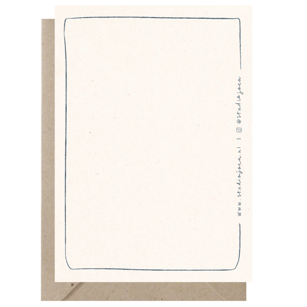 Dit kaartje gedrukt op papier van 5% hennepvezel, 40% gerecycled papier en 55% nieuwe papiervezels (FSC gecertificeerd). Een duurzame keuze dus! Af en toe zie je in het papier lichte vezeltjes en speelse spikkeltjes.