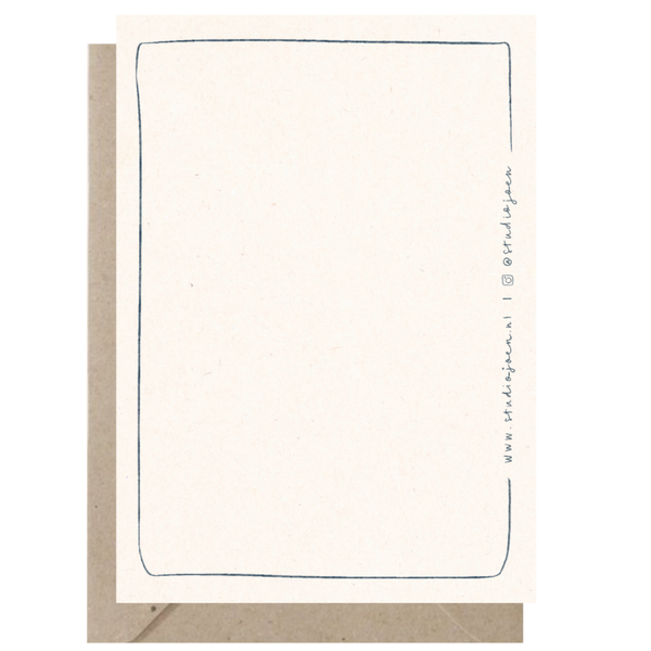 Dit kaartje gedrukt op papier van 5% hennepvezel, 40% gerecycled papier en 55% nieuwe papiervezels (FSC gecertificeerd). Een duurzame keuze dus! Af en toe zie je in het papier lichte vezeltjes en speelse spikkeltjes.